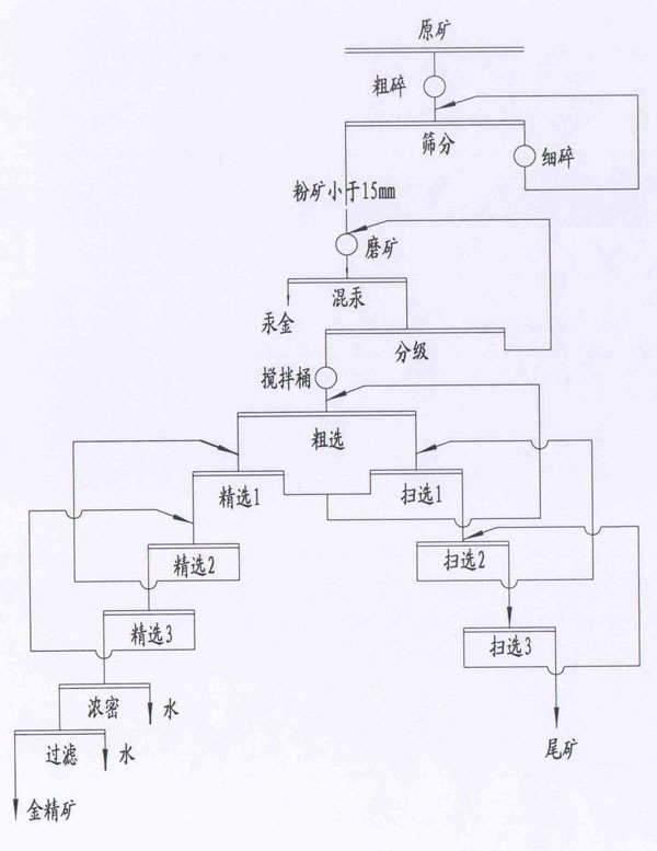 金矿物的浮选一般采用一段磨矿-浮选流程,对于堪布粒度不均匀的矿石可以采用阶段磨浮工艺。我国普遍采用一段磨浮-浮选流程,从而实现有用矿物的富集。